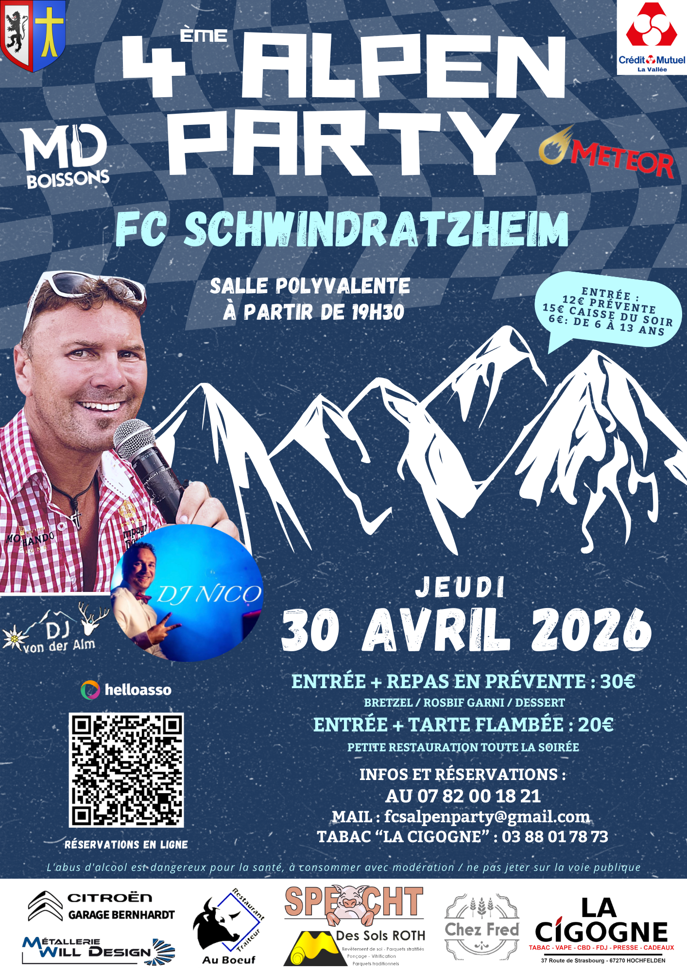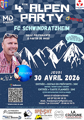 Alpen Party ! Soirée dansante avec repas animée par DJ Nico puis ballermann avec DJ Von der Alm. Restauration et buvette sur place. Pensez à réserver.