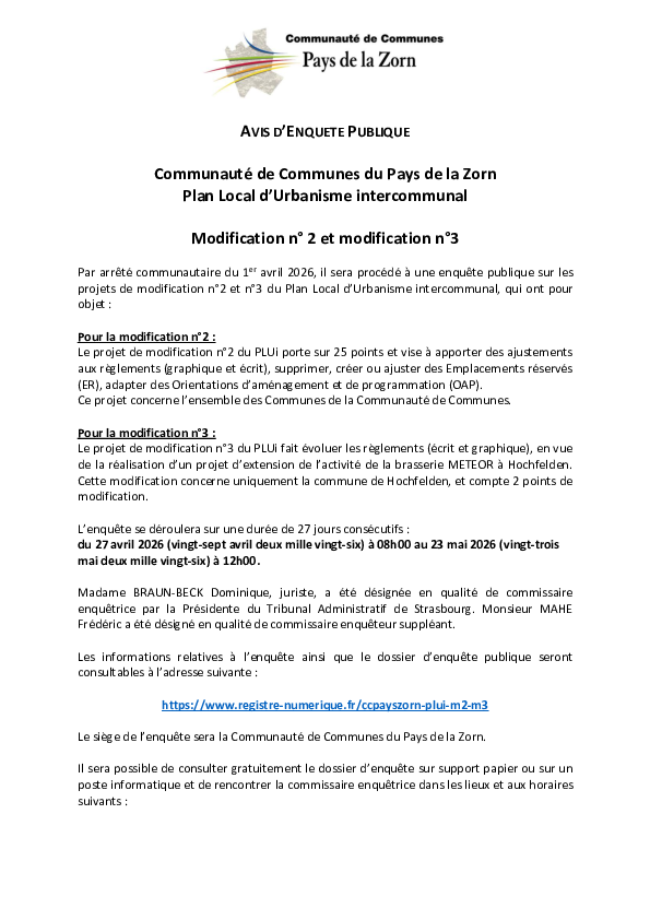 Par arrêté communautaire du 1er avril 2026, il sera procédé à une enquête publique sur les projets de modification n°2 et 3 du Plan Local d'Urbanisme intercommunal.