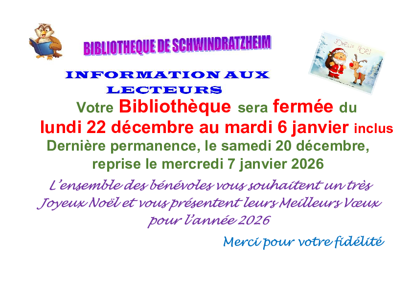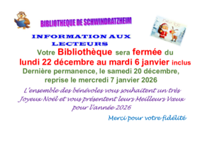 Schwindratzheim > Les actualités communales > Fermeture bibliothèque