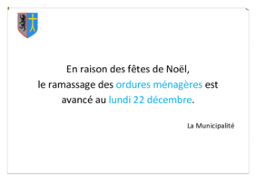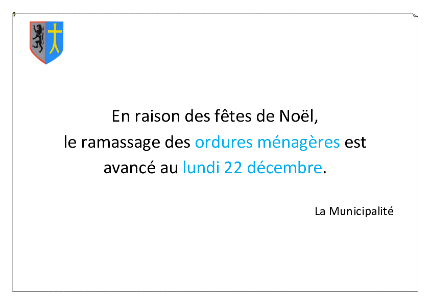 En raison des fêtes de Noël, le ramassage des ordures ménagères est avancé au lundi 22 décembre.